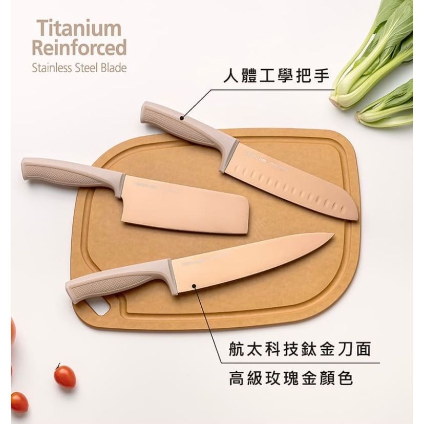 Neoflam 奶茶粉鈦金刀具6件組 ⭐️航太科技鈦金刀面,對人體無害的無毒金屬 ⭐️銳利的刀鋒,高強度不銹鋼與鈦金相結合 ⭐️輕便且使用時手腕不費力,符合人體工程學設計 ⭐️刀柄表面紋路設計,增加止滑效果 產品編號:FIKA30 產品產地:中國製造 產品顏色:奶茶粉 產品尺寸:6.5吋菜刀-297x65mm 7吋三德刀-310x45mm 8吋主廚刀-339x47mm ⚠️第一次使用前及每次使用完,請使用中性清潔劑加清水清洗後擦乾,並於乾燥處存放 ⚠️不適用鐵刷及含金屬的菜瓜布,請使用海綿或菜瓜布清洗 ⚠️請勿使用腐蝕性清潔劑 ⚠️請遠離火源、高溫,勿放置於沸水中,避免產品變形 ⚠️請搭配砧板使用刀具 ⚠️避免在骨頭和冷凍等堅硬食物上使用,以免損壞 ⚠️請勿用於洗碗機 ⚠️請放置於兒童不可觸碰之處 ⚠️請勿將刀具做其他用途